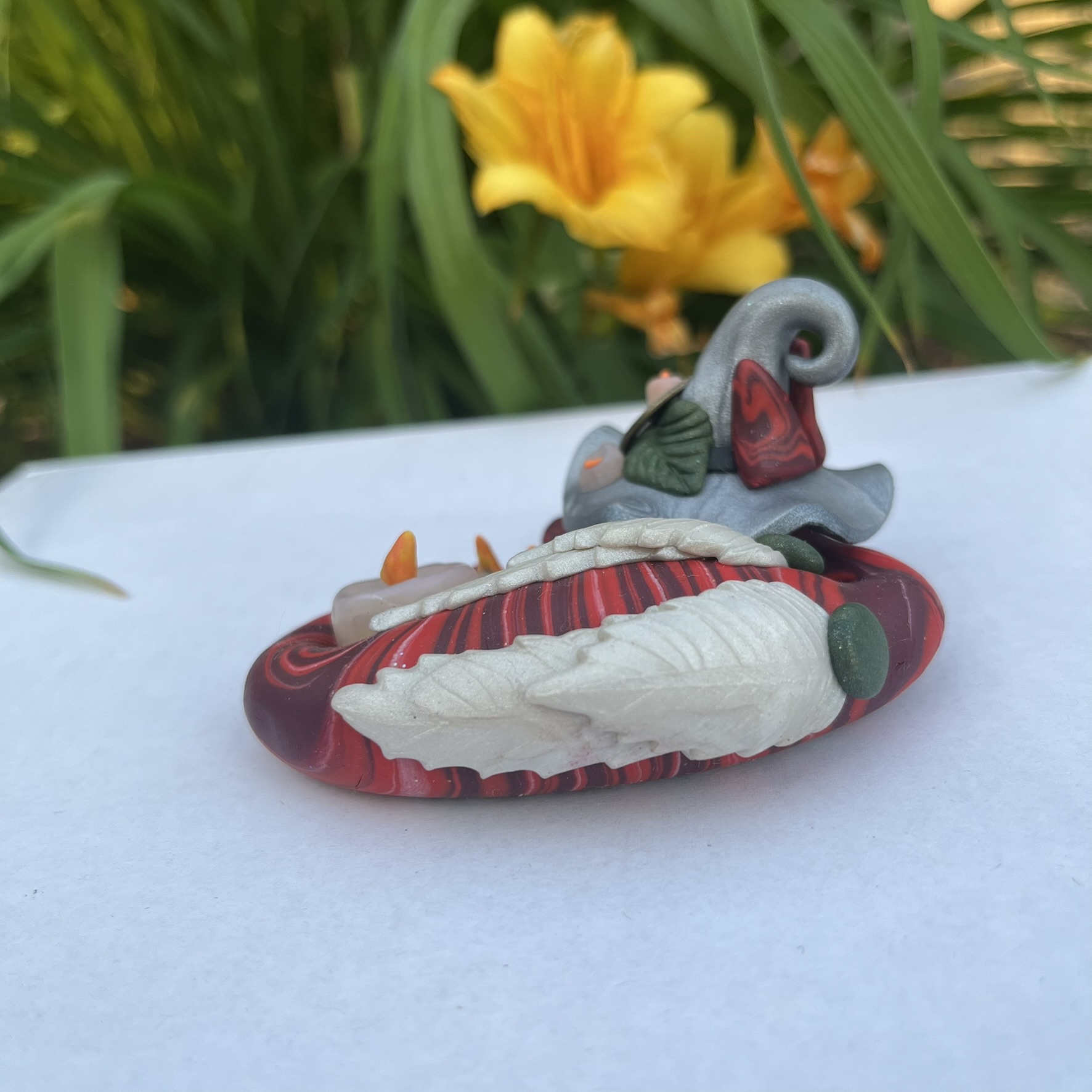 They are made using oven-bake polymer clay with a tinfoil and wire armature ("skeleton") underneath and occasionally contain details made from other materials including: crystals, stones, beach glass, wire, and other accessories. The pieces are all waterproof and weather resistant, making them perfect for indoor or outdoor display! Just be sure they stay out of reach of small children or animals who may knock them over or mistake them as toys, because while they are durable and aren't easily broken accidentally, they are still fragile and must be handle with care <3