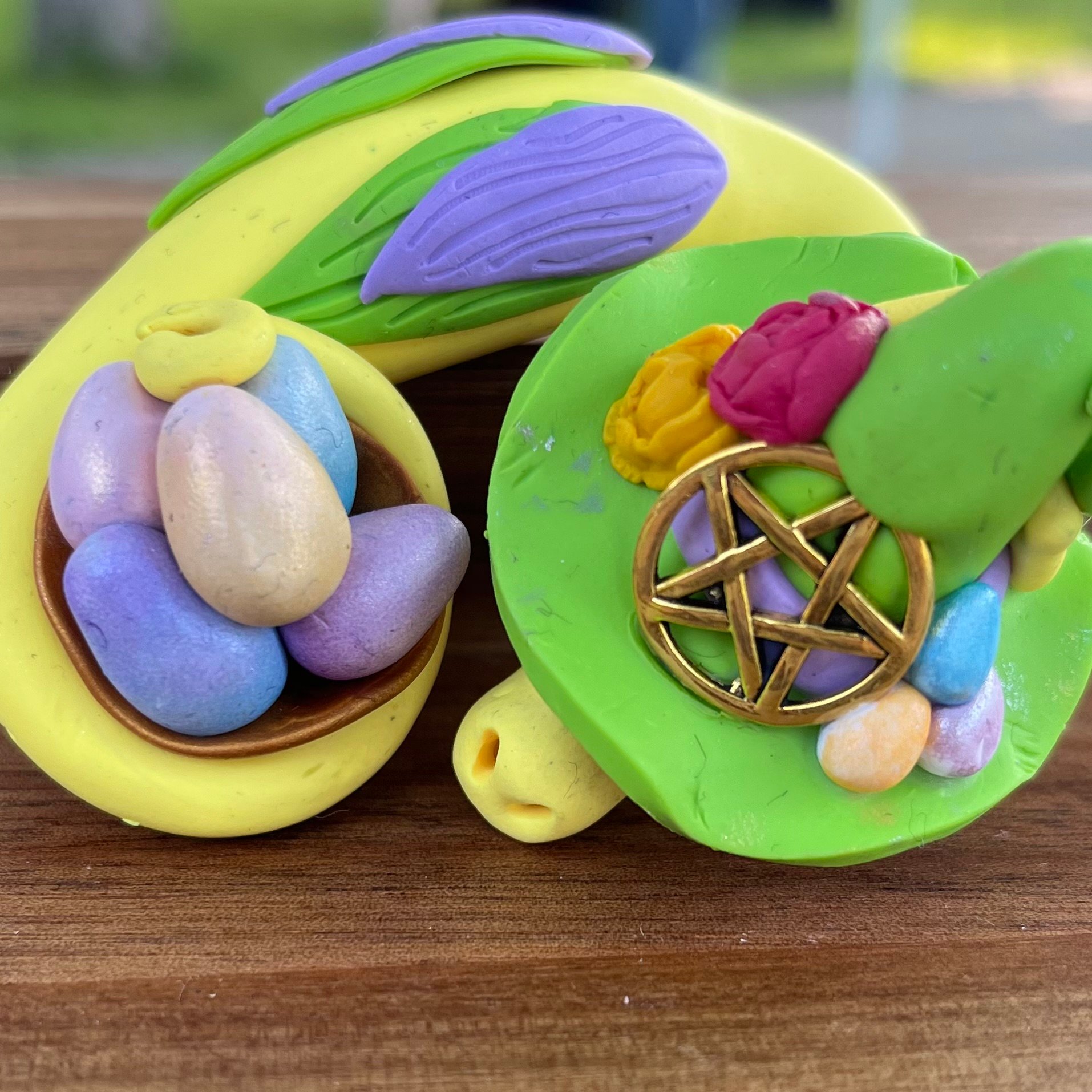They are made using oven-bake polymer clay with a tinfoil and wire armature ("skeleton") underneath and occasionally contain details made from other materials including: crystals, stones, beach glass, wire, and other accessories. The pieces are all waterproof and weather resistant, making them perfect for indoor or outdoor display! Just be sure they stay out of reach of small children or animals who may knock them over or mistake them as toys, because while they are durable and aren't easily broken accidentally, they are still fragile and must be handle with care <3